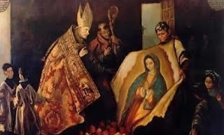 Tercera entrevista con el señor Obispo. «Al llegar al palacio del obispo, salieron a su encuentro el mayordomo y otros criados del prelado. Les rogó que le dijeran que deseaba verle; pero ninguno de ellos quiso, haciendo como que no le oían, sea porque era muy temprano, sea porque ya le conocían, que sólo los molestaba, porque les era importuno; y, además, ya les habían informado sus compañeros, que le perdieron de vista, cuando habían ido en sus seguimiento. Largo rato estuvo esperando. Ya que vieron que hacía mucho que estaba allí, de pie, cabizbajo, sin hacer nada por si acaso era llamado; y que al parecer traía algo que portaba en su regazo, se acercaron a él, para ver lo que traía y satisfacerse. Viendo Juan Diego que no les podía ocultar lo que traía, y que por eso le habían de molestar, empujar o aporrear, descubrió un poco, que eran flores; y al ver que todas eran diferentes rosas de Castilla, y que no era entonces el tiempo en que se daban, se asombraron muchísimo de ello, lo mismo de que estuvieran frescas, y tan abiertas, tan fragantes y tan preciosas. Quisieron coger y sacarle algunas; pero no tuvieron suerte las tres veces que se atrevieron a tomarlas: no tuvieron suerte, porque cuando iban a cogerlas, ya no veían verdaderas flores, sino que les parecían pintadas o labradas o cosidas en la manta.
